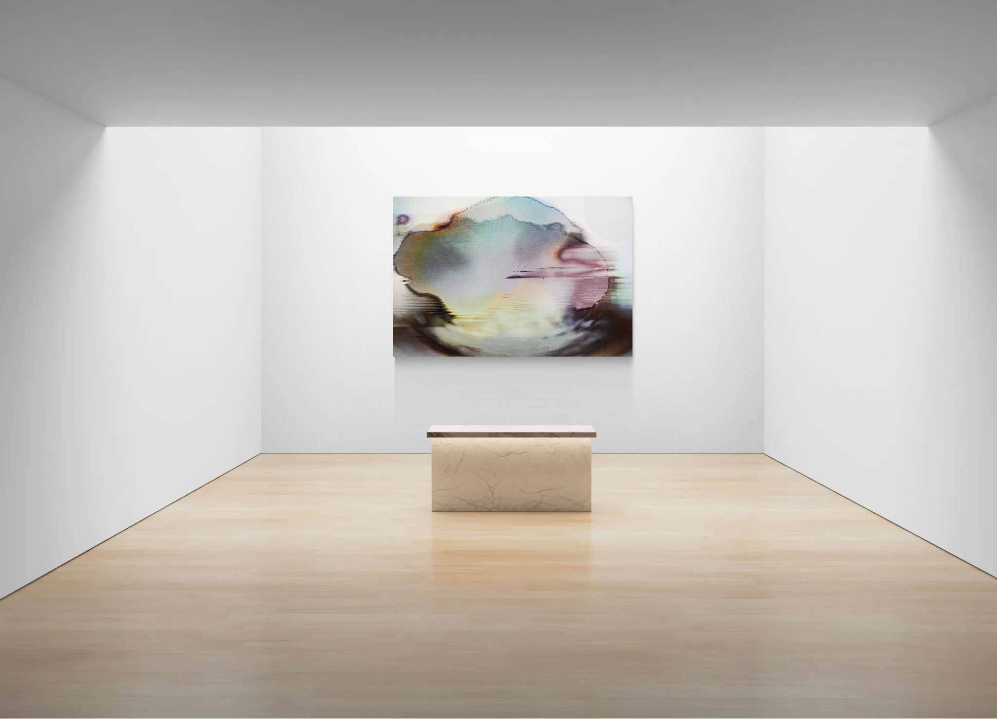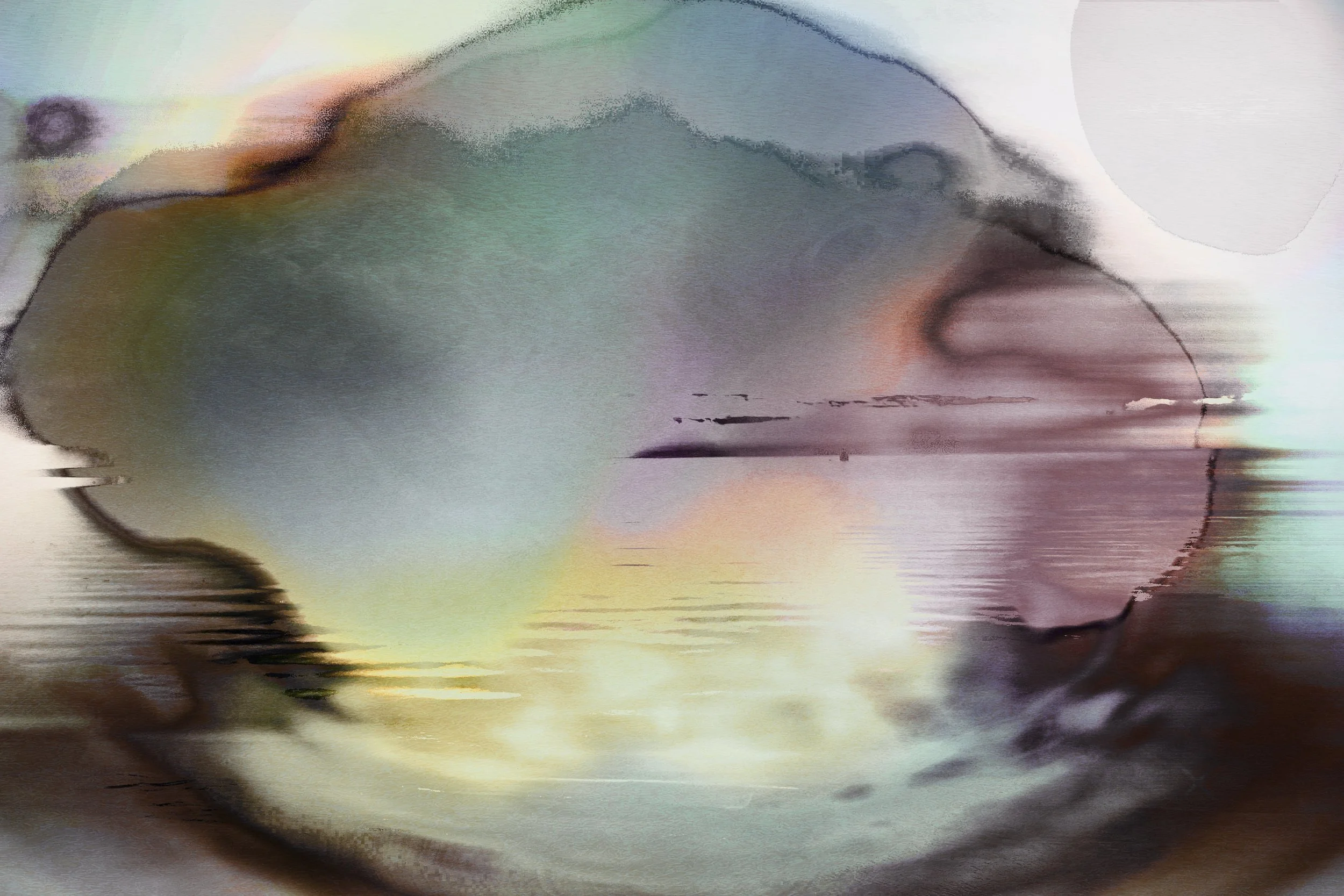 The green layer that appears in the lower portion of the composition holds a fluctuating distance from the light above, moving closer and farther away. Neither element is assigned a fixed role. Their relationship can be read as balanced, or as something on the verge of instability.