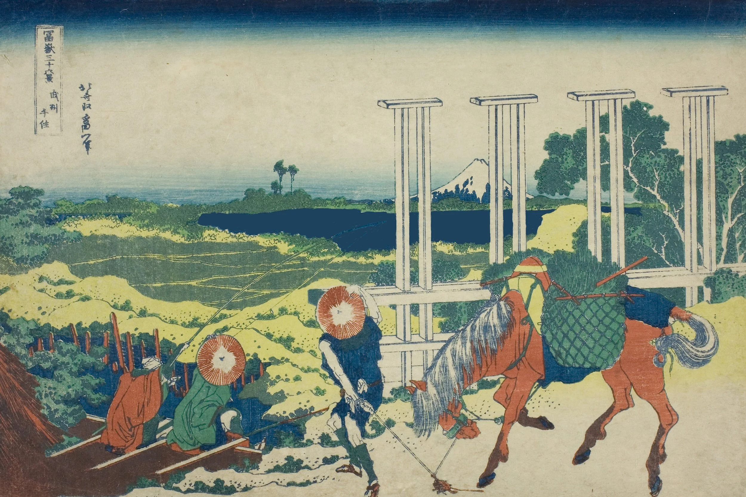 Uncharacteristically for Hokusai, the composition is split cleanly between left and right