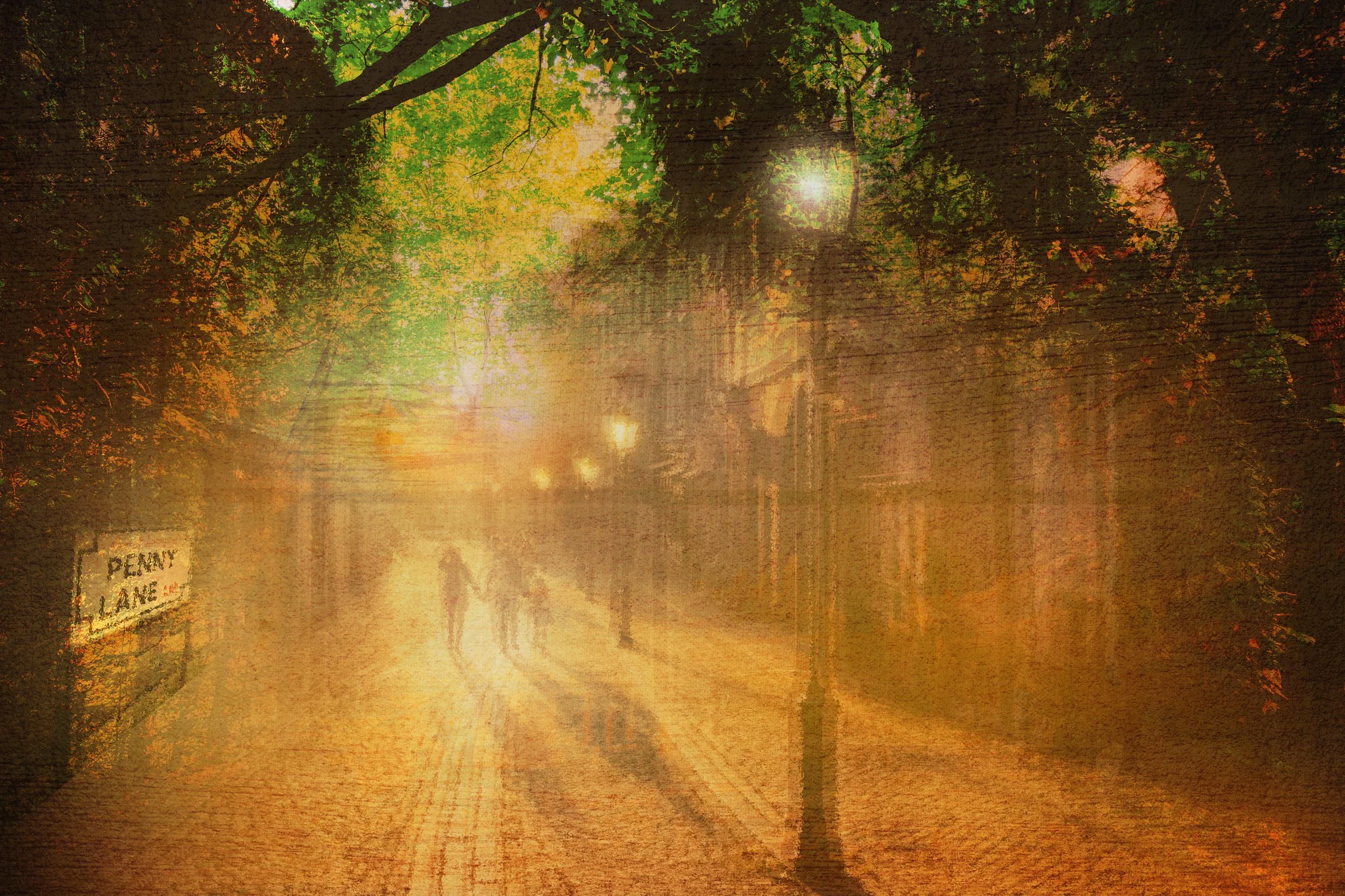 Memories do not preserve perfect forms. Over time, shapes deform, details fade, and only light remains as the last witness to time. Like an object glimpsed in near darkness, the mind must reconstruct what it sees. In "Penny Lane," the figures, street, and architecture do not exist as solid forms but as impressions—dissolving and reforming within the golden mist of recollection.