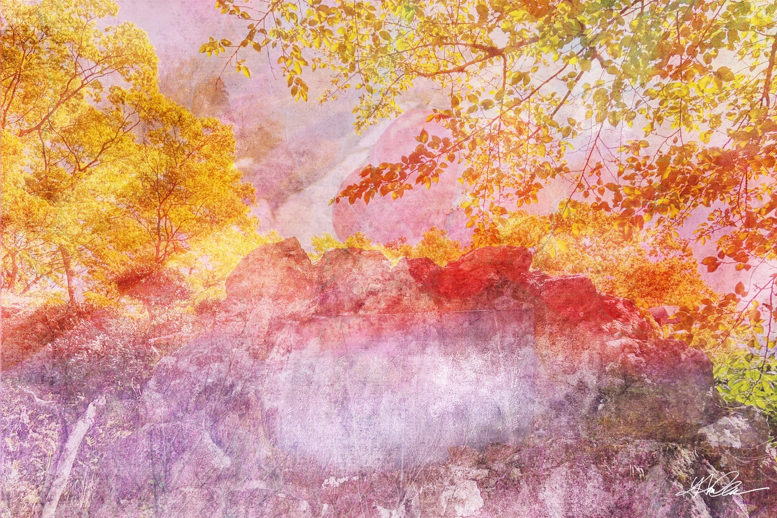 This artwork captures the timeless beauty of the 荒城の月石碑, a monument dedicated to the iconic Japanese song "Kojo no Tsuki" (Moon Over the Ruined Castle) by Rentaro Taki. The stele, standing amidst nature's vibrant hues, reflects a poignant harmony between cultural heritage and the natural world.