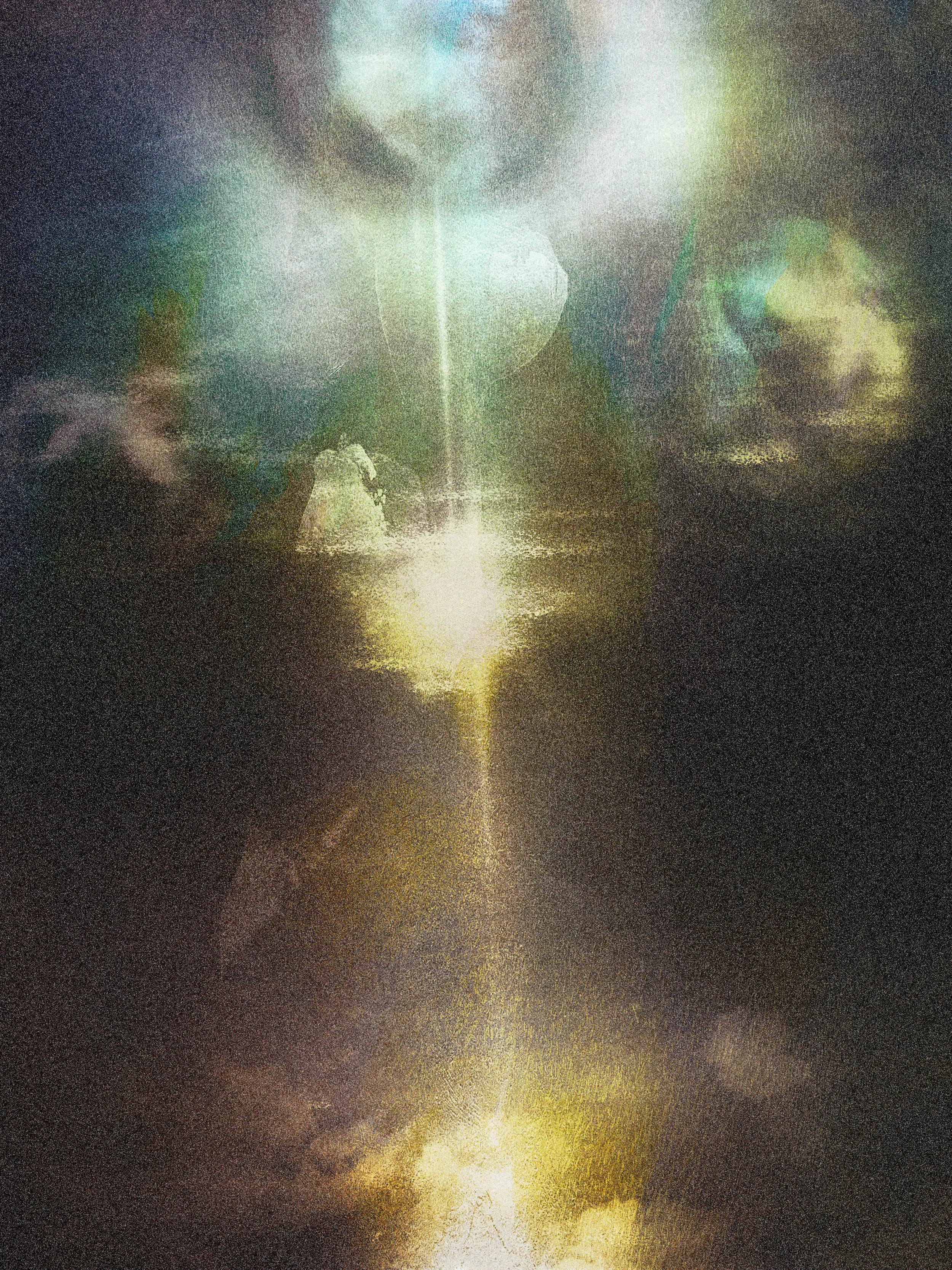 Joy of Soul speaks of the soul’s delight in existence. A vertical beam of golden light flows upward through veils of blue, green, and violet, forming a radiant axis that steadies and uplifts. This light does not serve to illuminate what surrounds it; it is the soul itself, revealed as luminous joy.