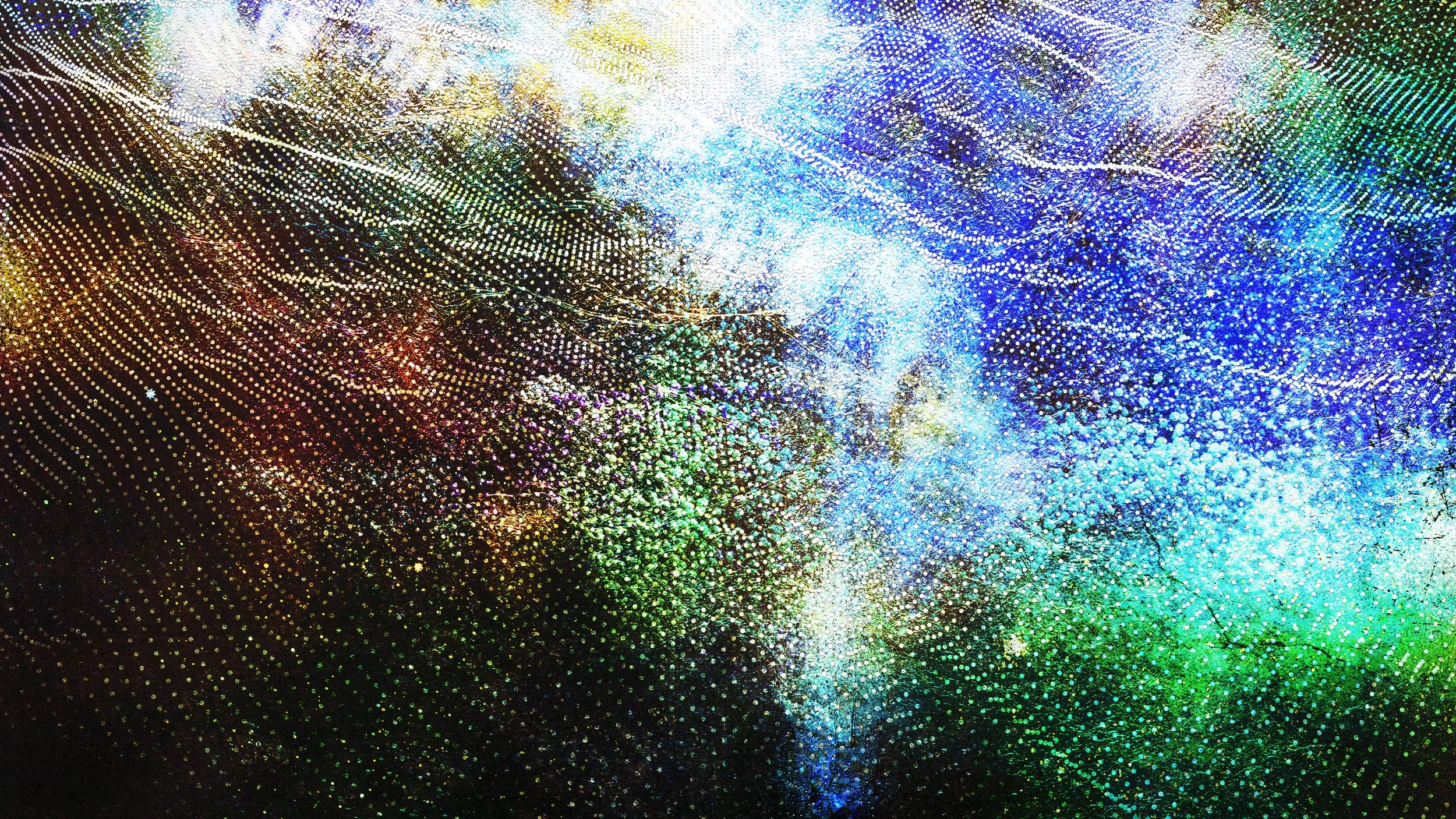 This work explores perception as surface — a thin membrane between inner and outer vision. A flowing mesh of luminous dots moves like rain across a field of color, evoking 皮膚感覚 (skin-sense): the sensation of light not just seen, but felt on the edge of the body.