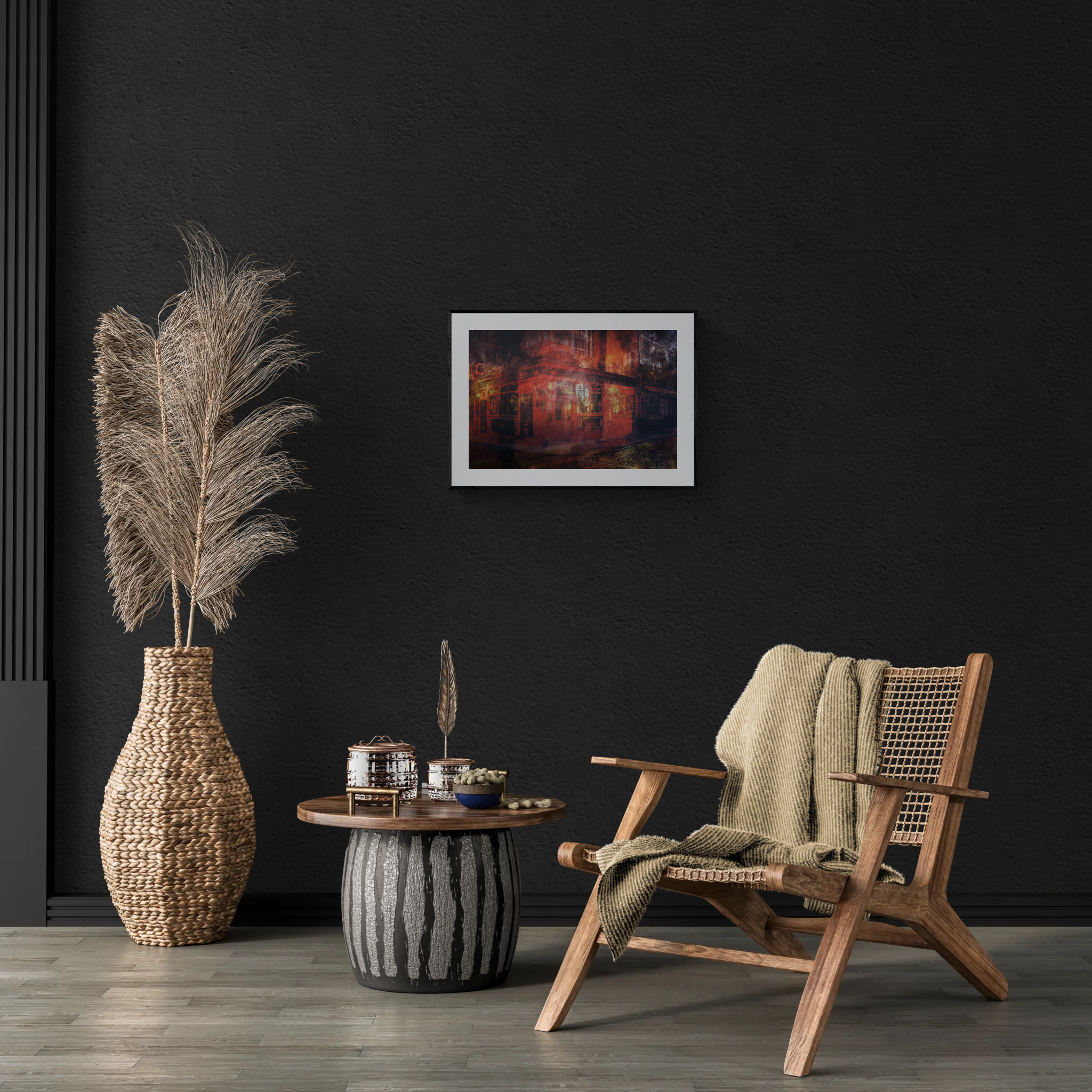 Around this center, the street falls into darker tones. Pavement, shadows, and surrounding structures lean toward black and deep brown, suggesting wet cobblestones and night air without fixing them in detail. The contrast between the illuminated pub and the subdued environment turns the corner into a visual anchor—a place where memory collects.