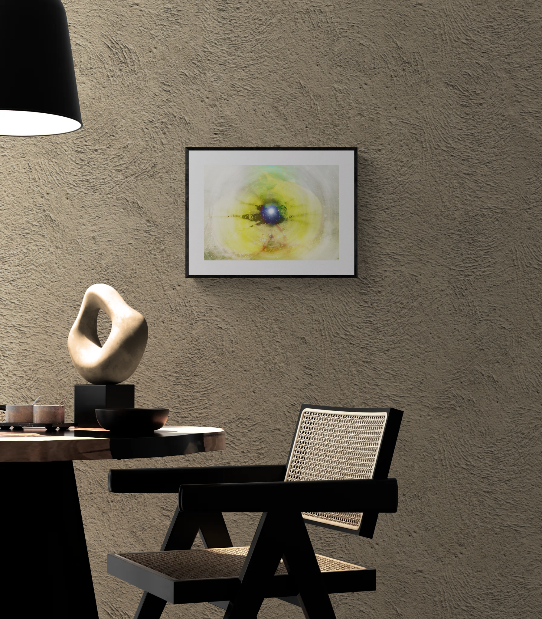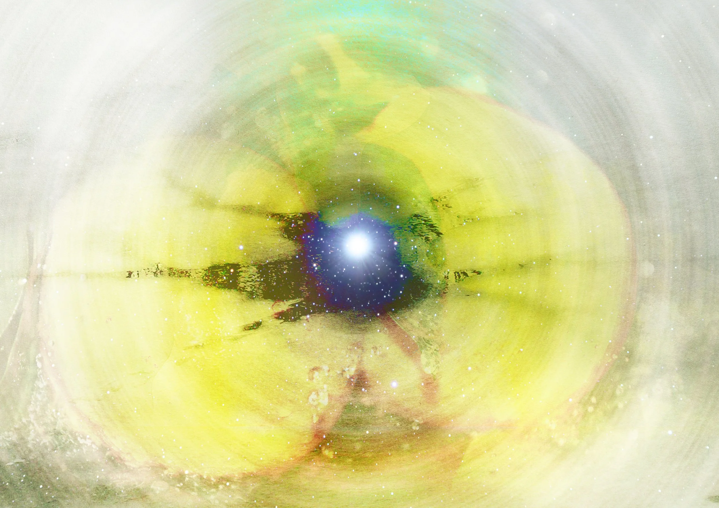 Semi-transparent layers of lemon yellow introduce a chromatic quality that evokes resonance with the natural world. These overlapping fields of light soften visual tension and suggest a force that reconnects separated elements, echoing the idea of renewed linkage between individuals. The central glow of Vega thus embodies its traditional recognition as a star associated with love, harmony, and guidance. Through controlled layering and restrained color, the composition translates these symbolic meanings into a structured visual field that emphasizes continuity, balance, and the enduring presence of stellar light.