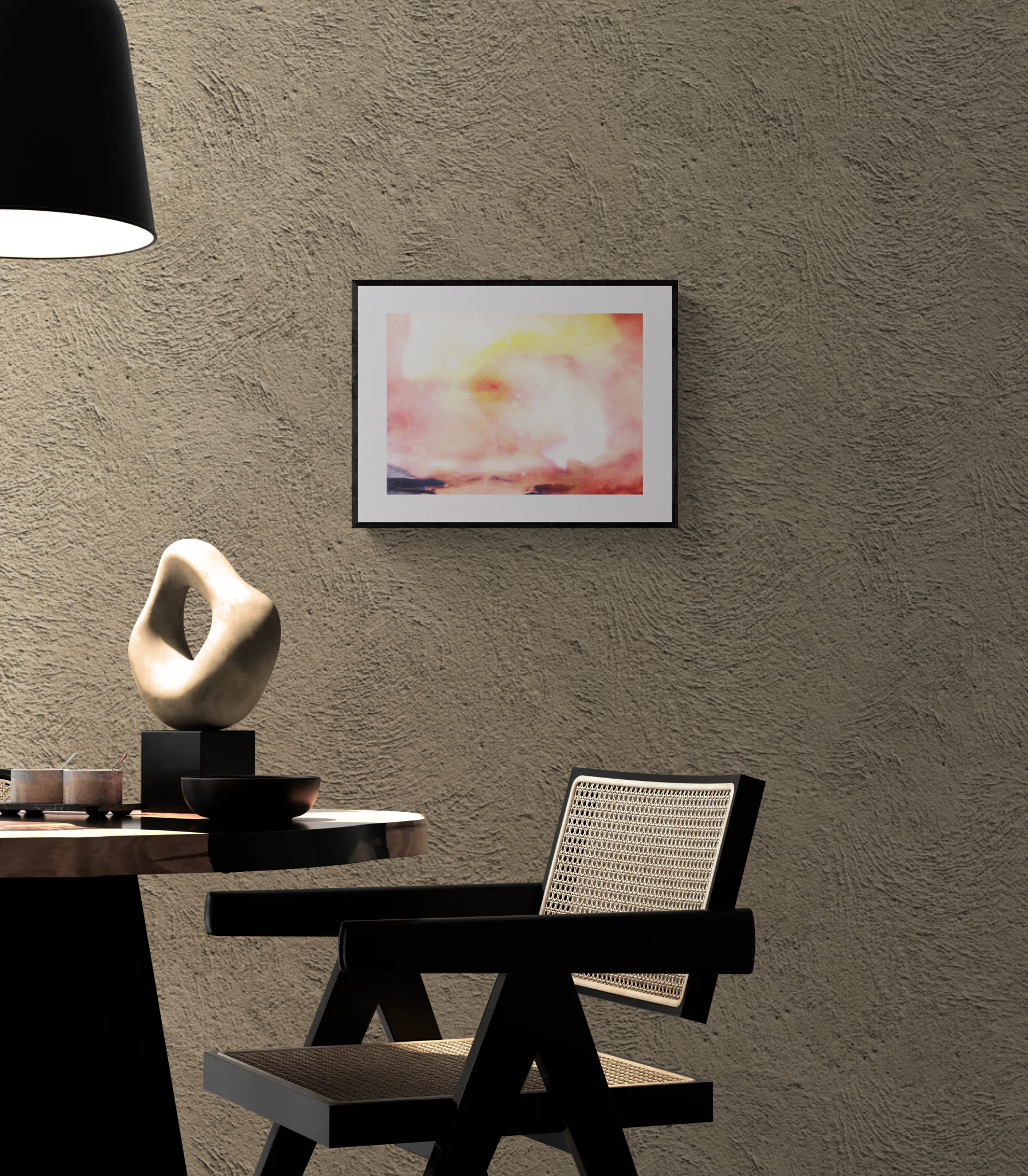 This work symbolically depicts the Orion constellation as it appears in the winter night sky. The orderly alignment of the three-star belt evokes an image of a gateway that seems to open beyond visible boundaries. The contrast between the red glow of Betelgeuse and the bluish-white radiance of Rigel expresses a visual equilibrium between power and stillness.