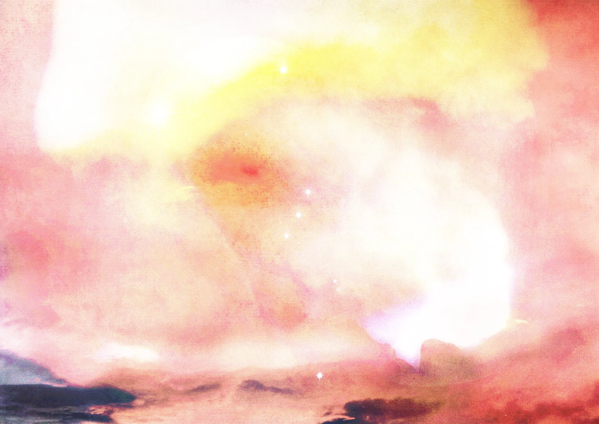Particles of light linking the stars are rendered as a soft atmospheric layer that supports and envelops this balance, giving form to an invisible presence that holds opposing forces in harmony. The gentle spread of pale pink light that surrounds the composition further softens the scene, wrapping the energy of movement and transition in a calm and luminous field. Through this interplay of color, space, and structure, the work conveys a sense of poised dynamism, suggesting a threshold where stillness and momentum coexist within the vastness of the night sky.