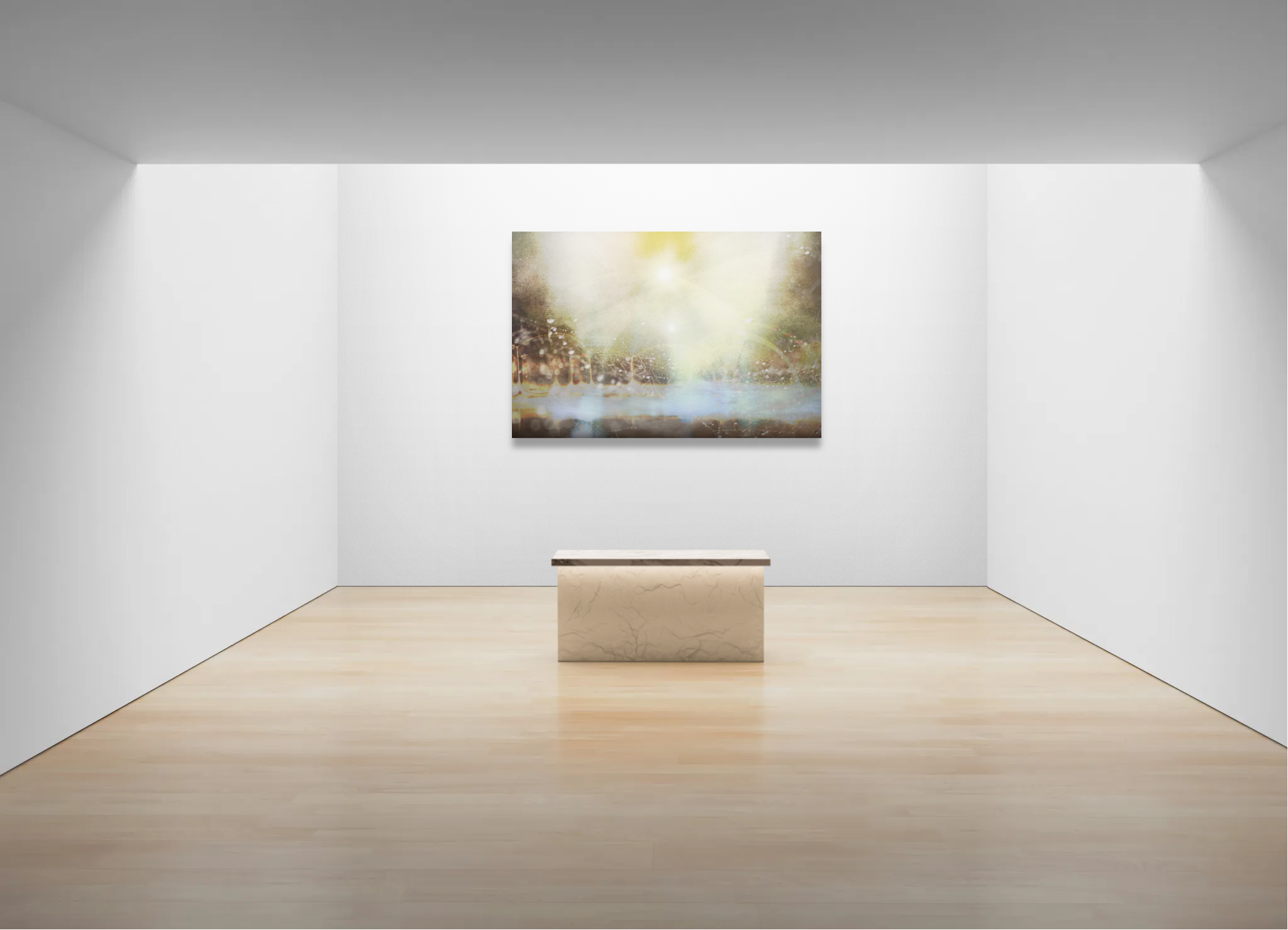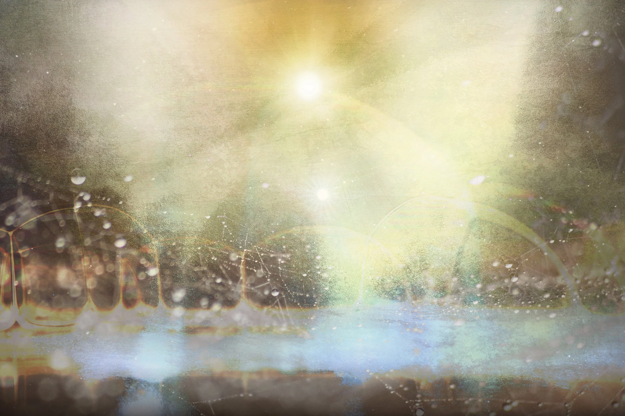 Shower of Light envisions the earth enveloped by descending radiance. In the lower zone, blue tones evoke the ocean and green hints at mountain form. A band of orange and yellow rises like dawn across the horizon. Above this threshold, a radiant field expands and pours downward, saturating the entire image. The layering dissolves boundary between matter and atmosphere, offering a moment where earthly elements and celestial light converge into a single field of perception. Viewers are invited to stand within the shower itself, to feel the sensation of being immersed in light rather than observing from a distance. The work suggests renewal and quiet transcendence, where familiar traces of land and water are lifted into luminous continuity. Through its balance of texture, atmosphere, and radiant flow, Shower of Light conveys a direct experience of transformation through illumination.