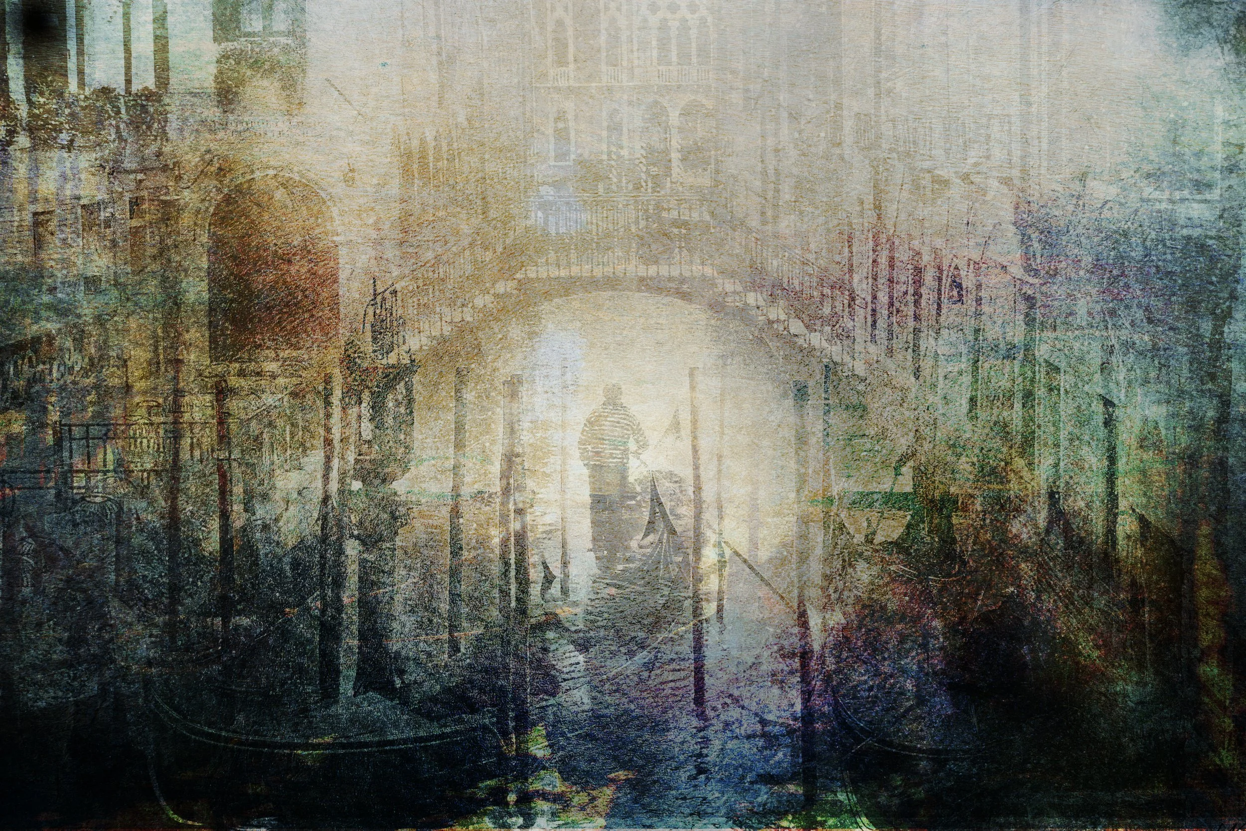 A gondolier moves through a corridor of light, framed by a bridge and facades that dissolve into color and grain. Piers and hulls rise as vertical marks, anchoring the scene. Venice appears less as a city of canals than as a luminous channel of passage and accumulated time.