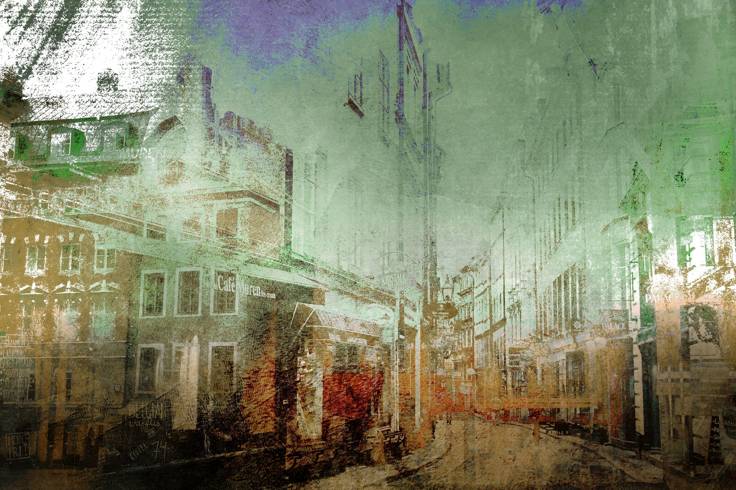 The image compresses a Vienna street into layered exposures where buildings, crowds, and reflected light merge. Architectural outlines remain identifiable, but motion, grain, and shifting color dominate. The work records how a city center is remembered after repeated crossings—structured by landmarks yet blurred by movement, atmosphere, and accumulated visual noise.