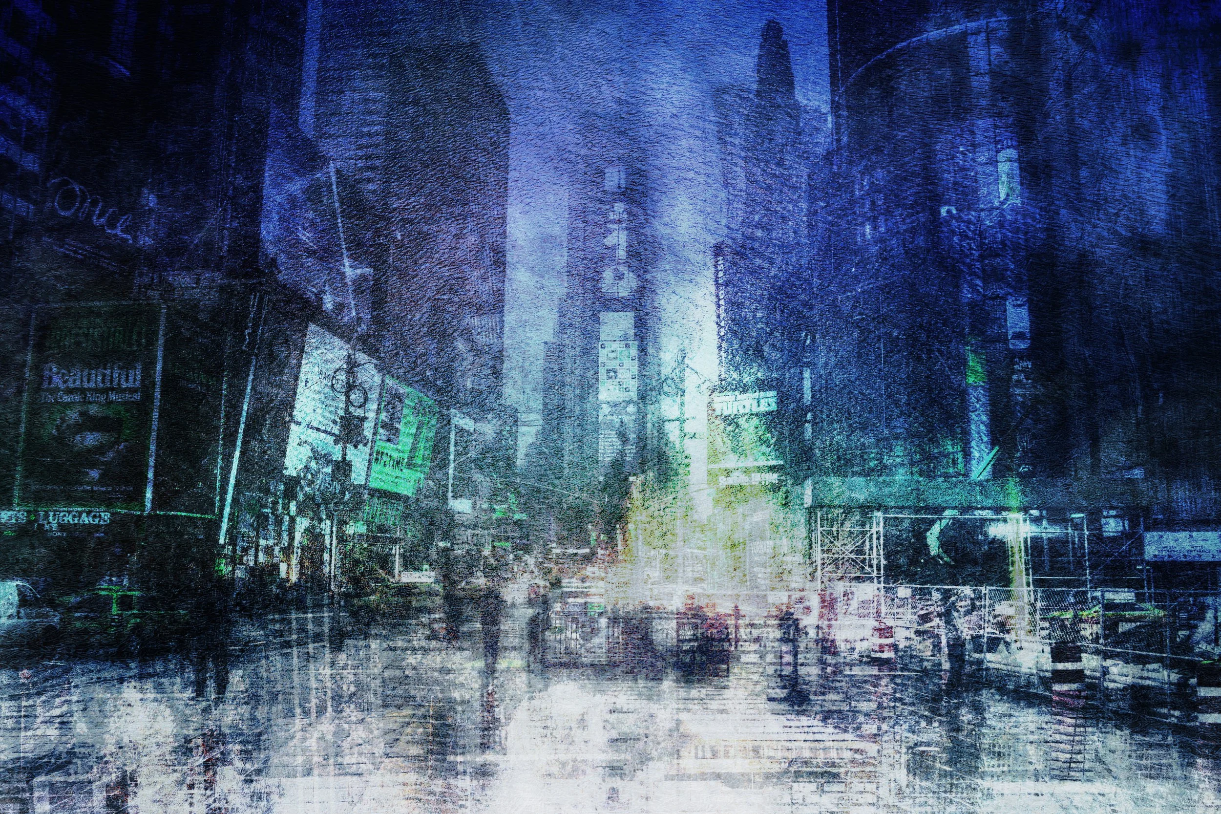 This work treats Times Square as a vertical field of light and noise. Towers, billboards, and figures dissolve into a dense blue haze, hovering between structure and glare. The scene registers the city’s pulse as an afterimage, where commercial signs become fragments of atmosphere rather than legible messages.